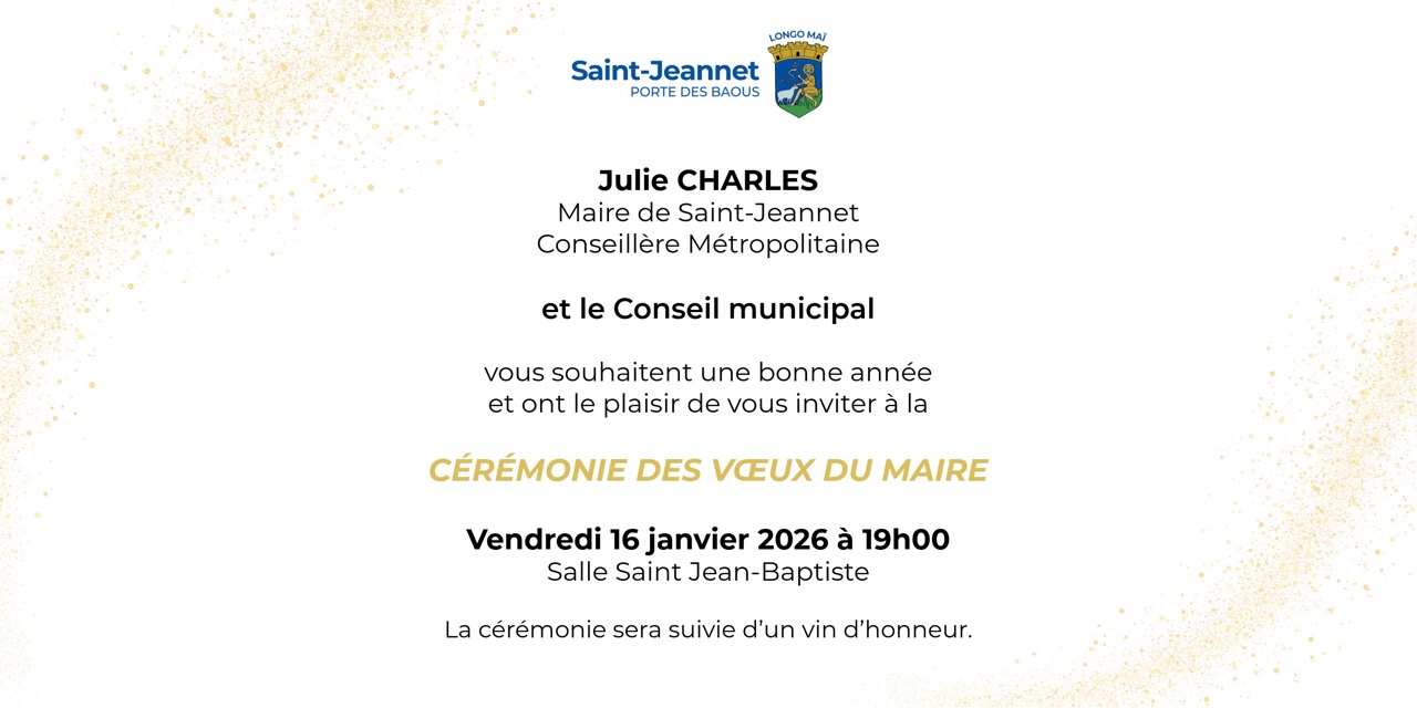 Julie CHARLES, Maire de Saint-Jeannet et le Conseil Municipal ont le plaisir de vous inviter à la Cérémonie des vœux du Maire.