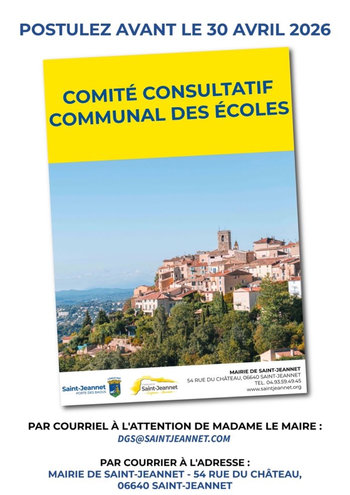 Merci d’adresser, avant le 30 avril 2026, une lettre de candidature par courriel à l’attention de Madame le Maire Julie Charles : dgs@saintjeannet.com