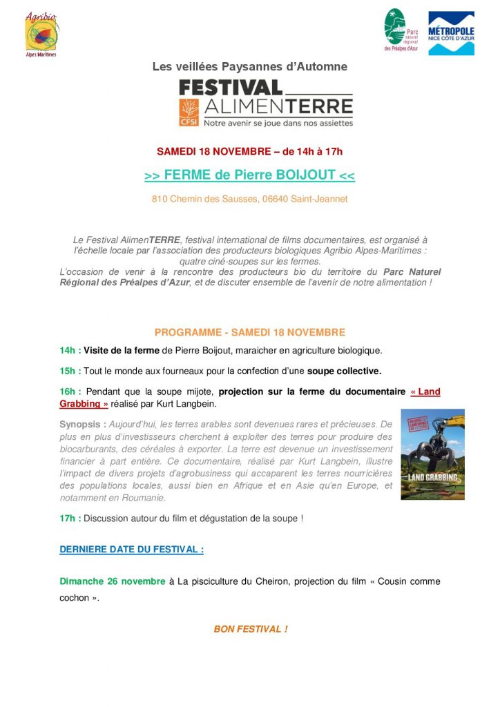 De 15 octobre au 30 novembre, le Festival international de films documentaires ALIMENTERRE s’organise dans les Alpes-Maritimes.
